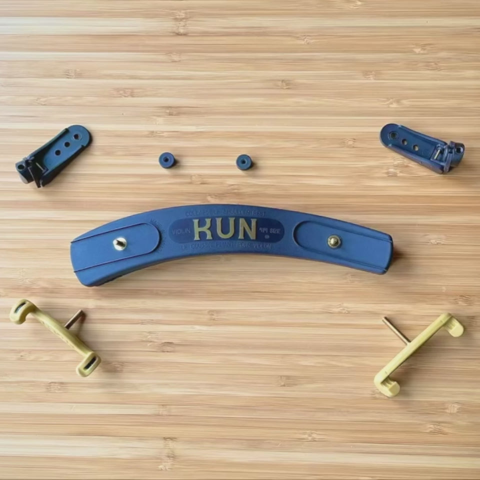 The Kun Mini fits 1/4, 1/8, 1/10 and 1/16 size violins. Height adjustable from 1 1/4 to 1 3/4 by lengthening/shortening screws. Four width adjustments on each end.